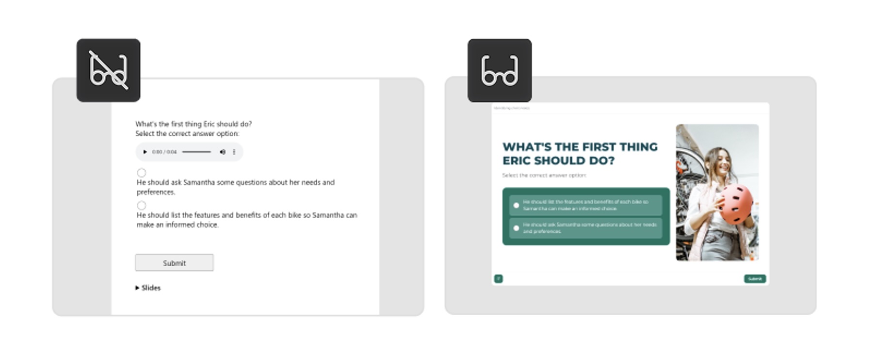 Accessibility doesn’t stop with videos or text. Interactive elements such as quizzes, simulations, and drag-and-drop exercises also need to be inclusive. Many tools require creating separate “accessible” versions of activities, which can be time-consuming and confusing to maintain.